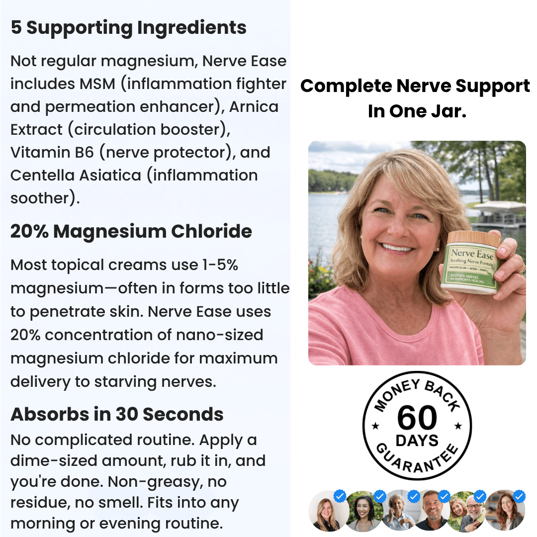 Most topical creams sit on the surface and provide temporary numbing. NerveEase is formulated to deliver magnesium directly through the skin to support the nerves behind your discomfort — not just mask the pain on top.